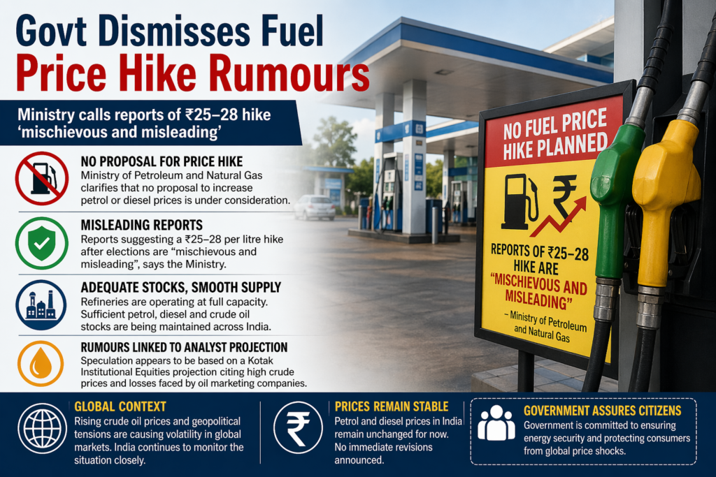 The Ministry of Petroleum and Natural Gas has firmly denied reports suggesting a sharp increase of ₹25–28 per litre in petrol and diesel prices, calling such claims “mischievous and misleading” and clarifying that no such proposal is under consideration.