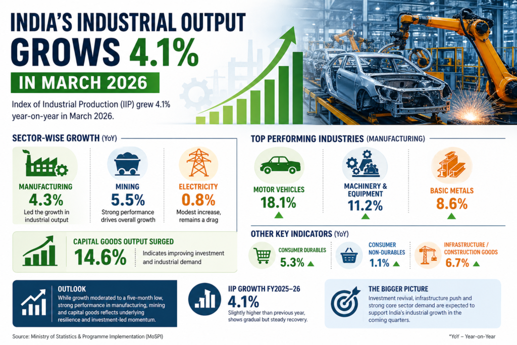 India’s industrial activity maintained steady momentum in March 2026, with the Index of Industrial Production (IIP) expanding 4.1% year-on-year, according to official data released by the Ministry of Statistics and Programme Implementation.