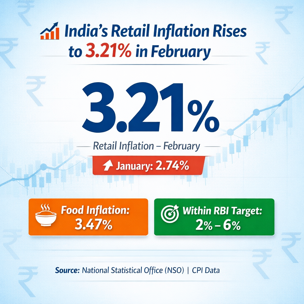 India’s retail inflation rose to 3.21% in February 2026, up from 2.74% in January, according to the latest data released by the National Statistical Office (NSO). The increase was primarily driven by higher food prices and rising costs in certain consumer categories.
