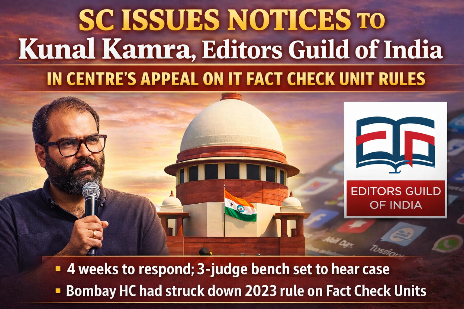 The Supreme Court of India has issued notices to several parties, including comedian Kunal Kamra and the Editors Guild of India, in connection with the legal challenge surrounding amendments to India’s Information Technology Rules 2023 related to government-run Fact Check Units (FCUs).